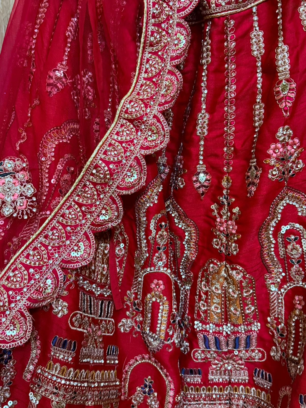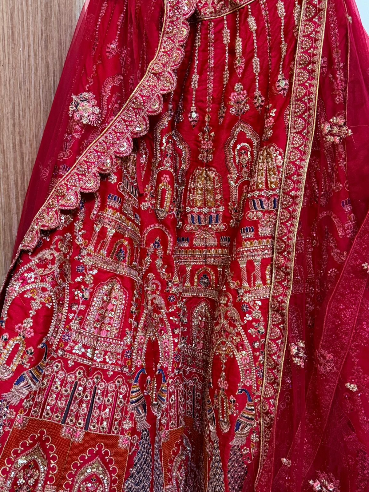 Lehenga Skirt: Deep red and heavily embellished with elaborate gold zari, zardozi, sequins, and threadwork, featuring grand architectural and paisley motifs arranged in panels and finished with ornate layered borders.