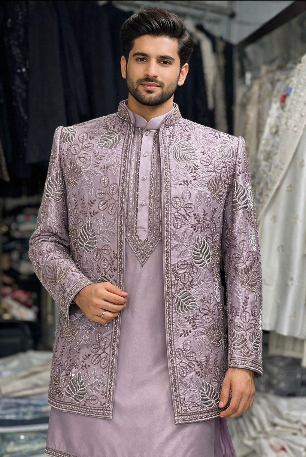 Elegant pastel lavender kurta paired with a richly embroidered Indo-western jacket. The jacket showcases intricate floral motifs, beautifully enhanced with delicate bead and sequin detailing. This refined ensemble offers a perfect balance of contemporary elegance and traditional craftsmanship—ideal for weddings, receptions, and festive celebrations.